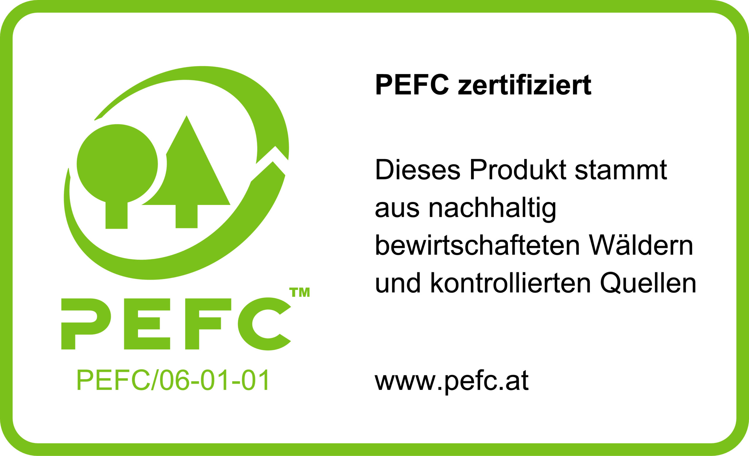 PEFC (Programme for the Endorsement of Forest Certification Schemes/ Programm zur Anerkennung von Forstzertifizierungssystemen) ist die weltweit führende Institution zur Förderung, Sicherstellung und Vermarktung nachhaltiger Waldbewirtschaftung. Holz und Holzprodukte mit dem PEFC-Siegel stammen nachweislich aus ökologisch, ökonomisch und sozial nachhaltiger Forstwirtschaft und unterstützen die Holzversorgung von morgen.