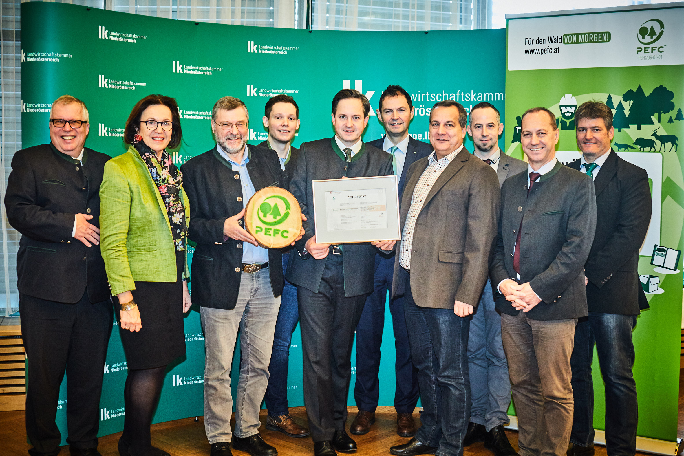 - 10. Dezember 2018 – Zertifikatsübergabe der LLKNÖ in St. Pölten. v.l.n.r.: PEFC-Beauftragter der Landwirtschaftskammer NÖ Ludwig Köck, Landwirtschaftskammer NÖ-Vizepräsidentin Theresia Meier, PEFC Austria-Obmann Kurt Ramskogler, Gerhard Pichler (PEFC), Landwirtschaftskammer NÖ-Präsident Johannes Schmuckenschlager, Kammerdirektor Franz Raab, Peter Sattler (Quality Austria), Clemens Kraus (Quality Austria), Forstdirektor der Landwirtschaftskammer NÖ Werner Löffler, Druckbeauftragter der Landwirtschaftskammer NÖ Gerhard Grübl. Copyright: LLK NÖ/ Franz Gleiß